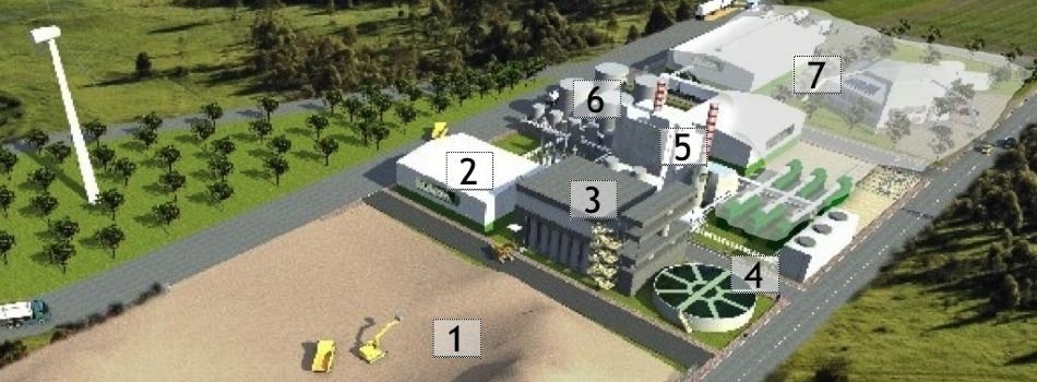 Yenepa Ltd.: Biomass (1), Pomace Processing (2), Furfural (3), Utilities (4), Power (5), Stores (6) and Future (7)